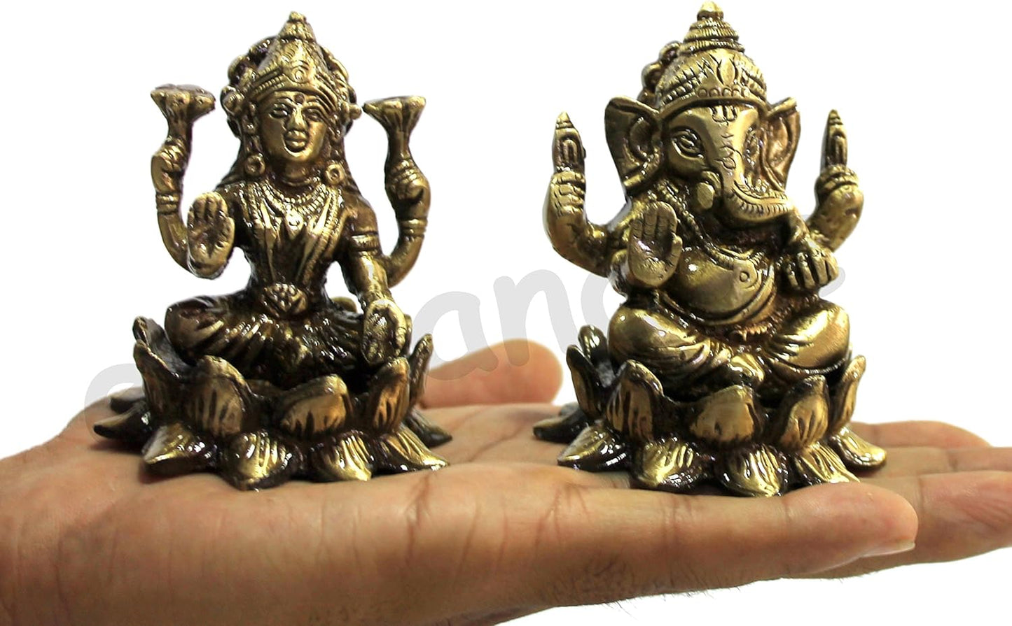 - 3" Brass Laxmi Ganesh Idol On Lotus Set, made of solid Brass for your Home/ Workplace/ Office/ Desk/ Gifts etc.