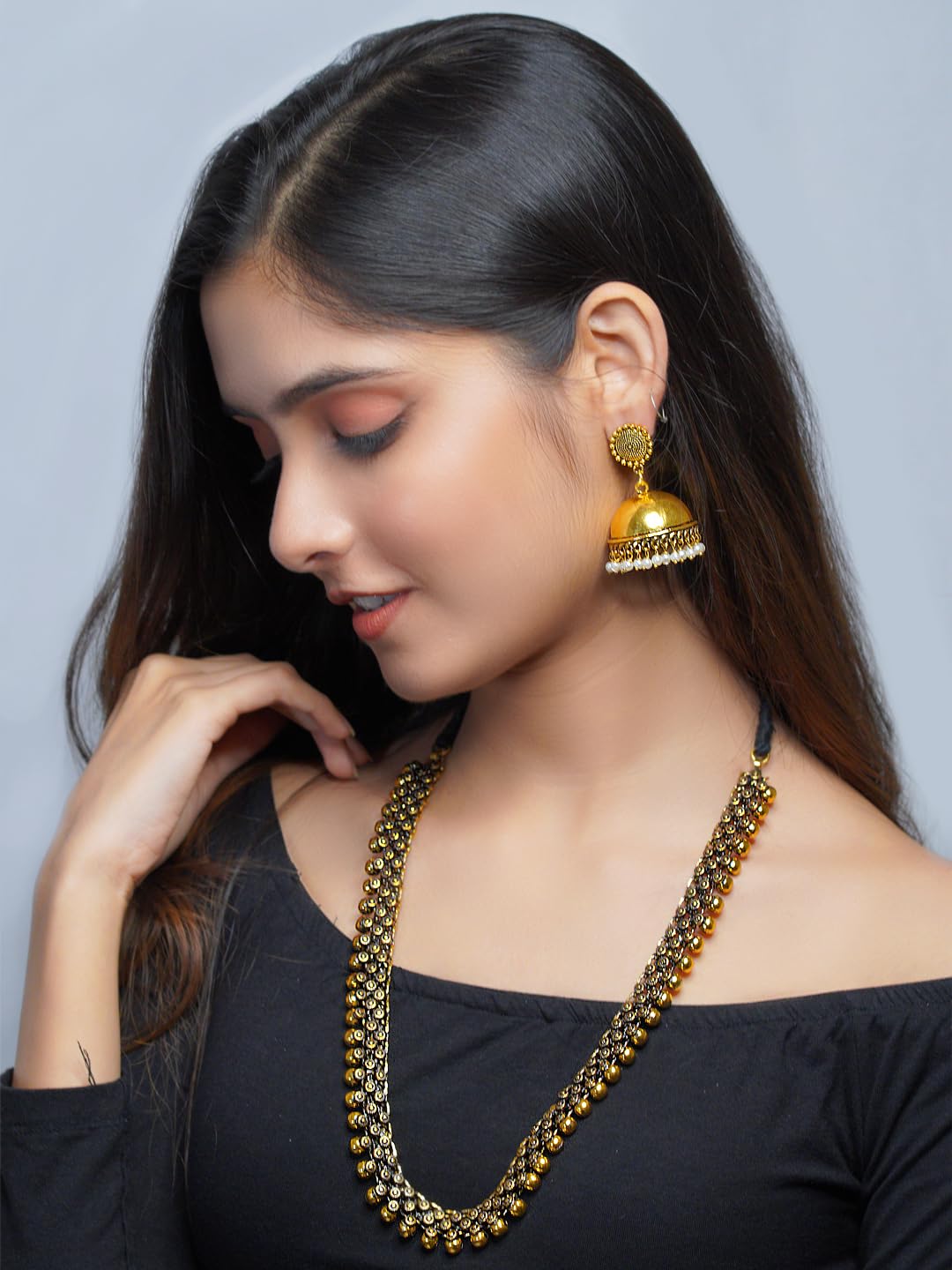 B0CJ74NX6Z- The jewellery set consists of a necklace and a pair of earrings. Gold-plated pearl beaded layered choker necklace has a lobster closure. A pair of matching studs' earrings have fishhook closure. Size & Fit: Necklace: 18 cm x 2.4 cm (Length x Width), Earrings: 2.5 cm x 2.5 cm (Length x Width) each, Material: Brass, Plating: Gold-plated, Stone type: Pearl.