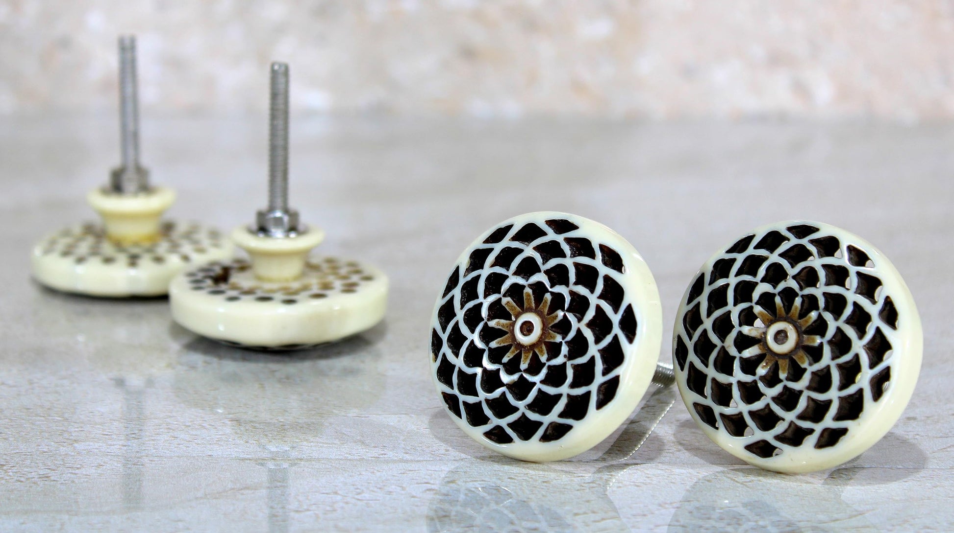 eSplanade Cupboard Cabinet Door Decorative Knobs - Set of 4 | Drawer Handles Cupboard Pulls Almirah Hooks | Round-Floral - Acrylic Plastic - Diameter 4 cms - White-Black (Floral Knob 1-12)