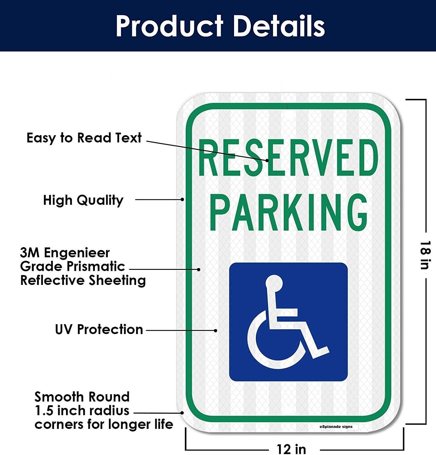 eSplanade Handicap Reserved Parking Self Glowing Retro Reflective Sign Sticker Decal - Easy to Mount Weather Resistant Long Lasting Ink - (Size -12"x18")