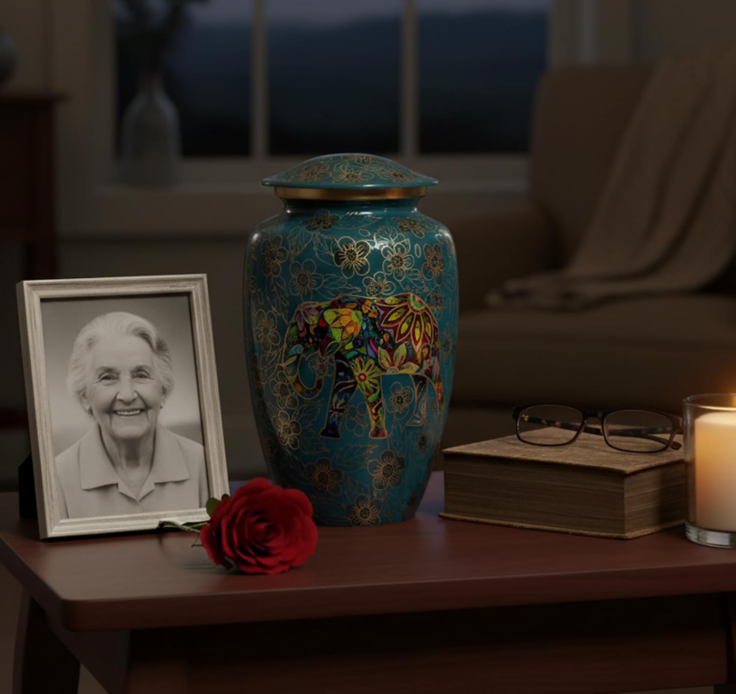 eSplanade Metal Cremation Urn Memorial Jar Pot Container | Full Size Urn for Funeral Ashes Burial | Elephant and Flowers Printed Metal Urn | Blue-Multi - 10" Inches