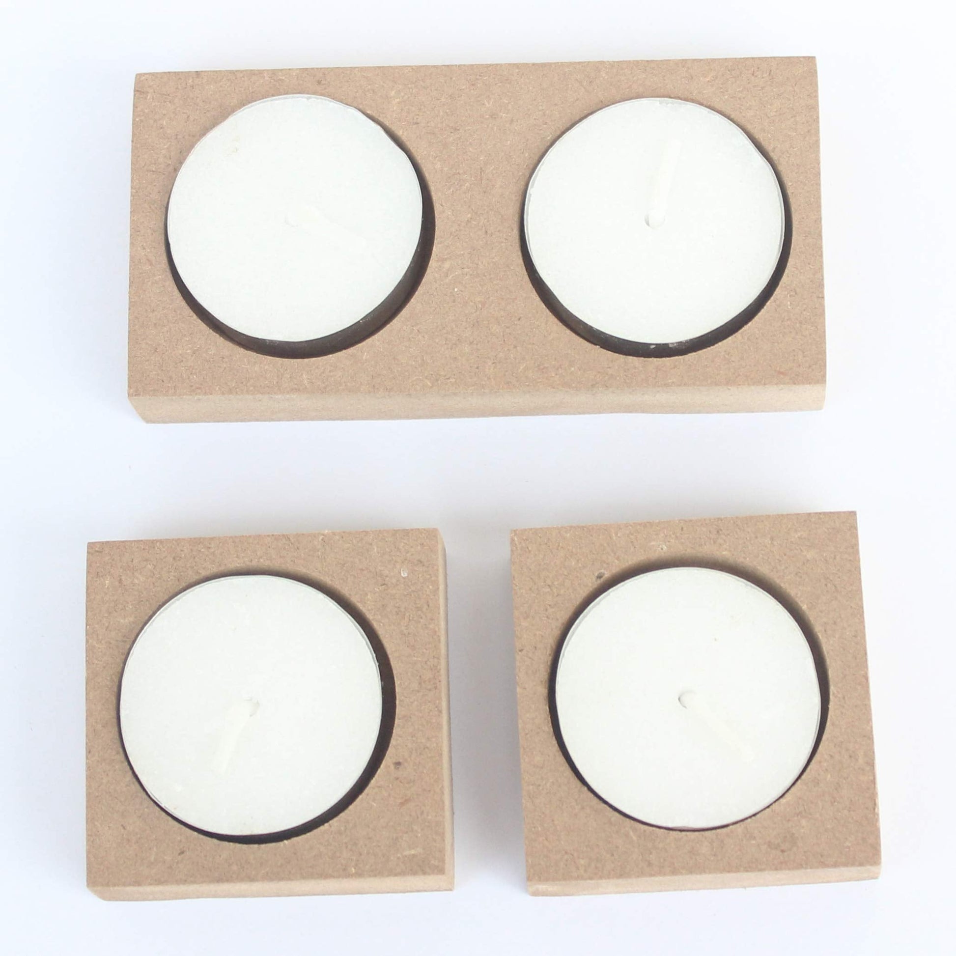 IVEI Wooden MDF DIY Tea Light Candle Holder with Candles - Set of 3(1 Double & 2 Single) - Plain MDF Wooden Candle Holders Blank for Painting Wood Sheet Craft, Decoupage, Resin Art Work & Decoration