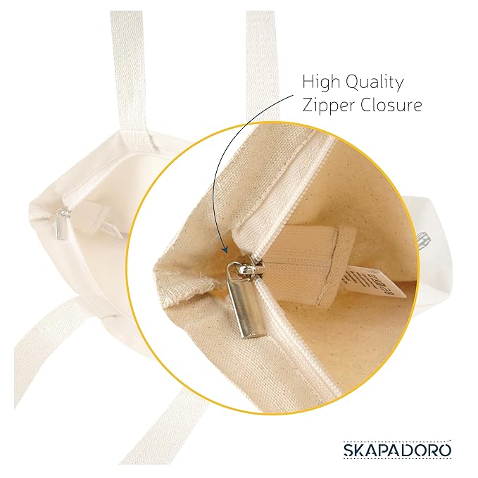 SKAPADORO, Canvas Zip Tote - 100% Cotton, Ecofriendly Printed Tote Bags For Travel, College & Beach, Shopping, Grocery, Easy to Wash Trendy Everyday Shoulder Bag