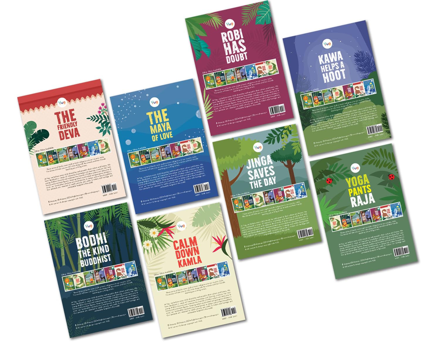 Join Raja the lion, Kamla the gharial, Bodhi the red panda, Jinga the rhinoceros, Kawa the blackbuck, Robi the monkey, Deva the snake, and Maya the dolphin in a colorful journey through India's diverse landscapes. Through engaging storytelling and vibrant illustrations, children learn about self-acceptance, friendship, kindness, dedication, selflessness, self-love, cleverness, and spreading joy. Each character teaches valuable lessons about emotions and empathy, fostering a deeper understanding of the world around us and the importance of compassion and acceptance. After enjoying each tale, children can express their creativity with coloring sheets, adding their own imaginative flair to the stories.